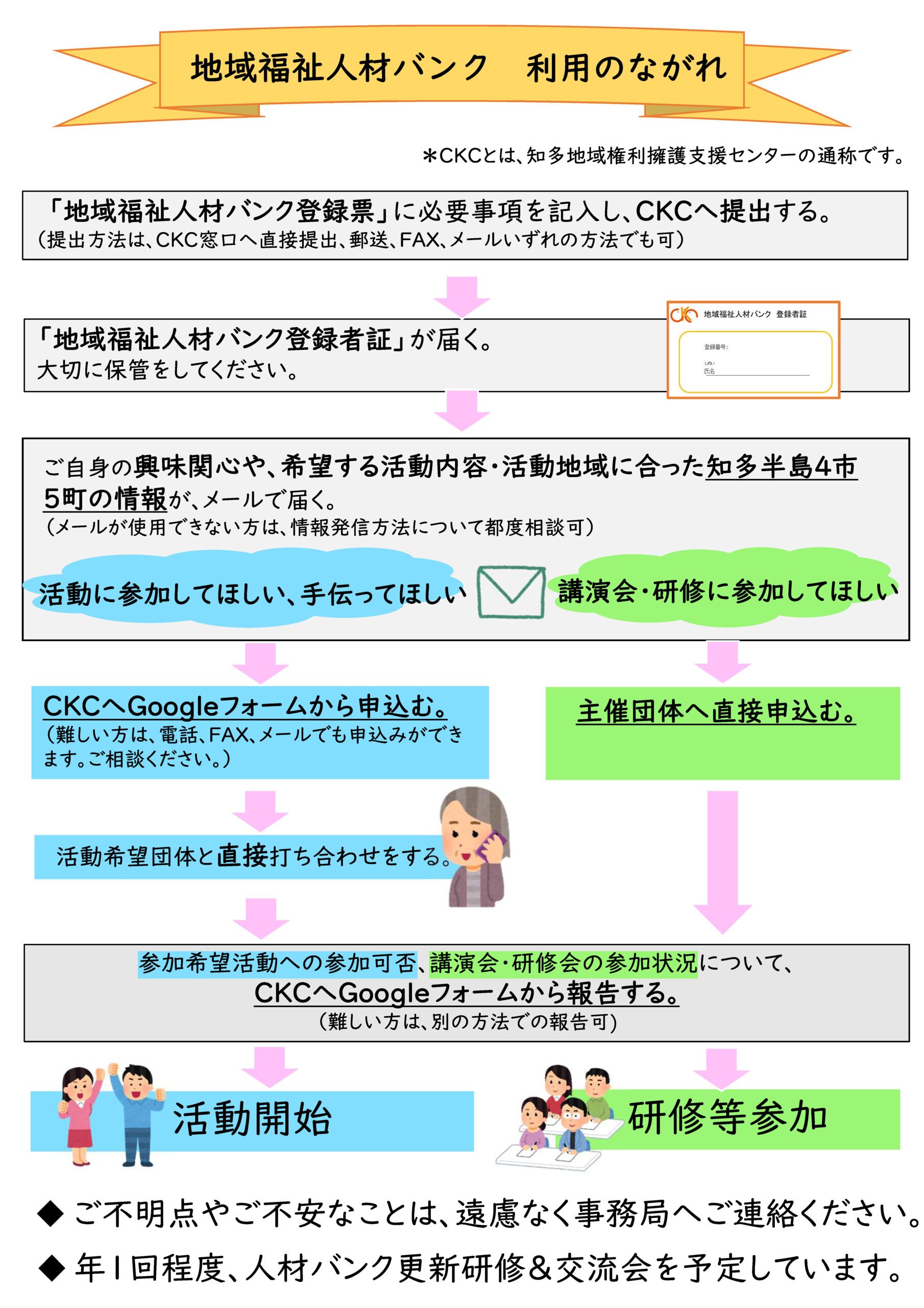 地域福祉人材バンクに登録するためには、知多地域権利擁護支援センターが主催する以下の研修(いずれか1つ以上)を受講していただく必要があります。