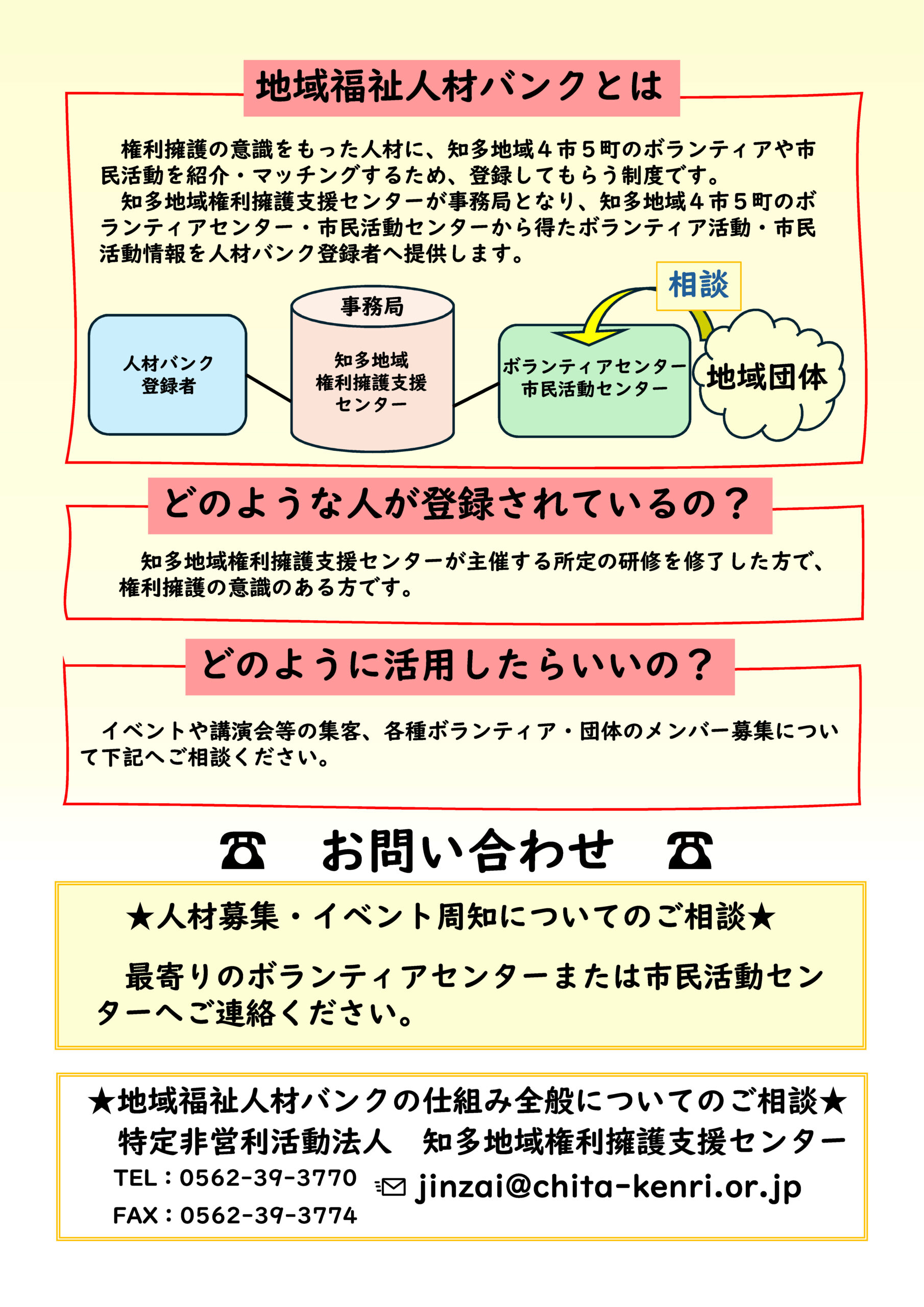 地域福祉人材バンク登録者が活動をとおして地域づくりに参加することで、権利擁護の意識が醸成された知多半島に発展することを目標としています。